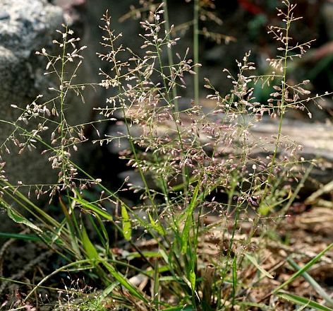 一年生草本。秆丛生,直立或基部倾匍,高10~100厘米,长短不齐。叶片线形,长3~26厘米,宽3~5毫米,边缘粗糙;叶鞘无毛;叶舌干膜质。圆锥花序狭长,长约为秆的1/2或超过之;小穗含花3~6朵,长不超过2毫米,卵圆形,淡绿色至淡紫色,小穗轴逐节断落;颖卵圆形,先端钝;外稃草质,无芒,具3脉,内稃较短;雄蕊2。颖果红棕色,倒卵圆形。花期8~9月。