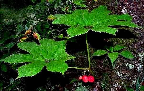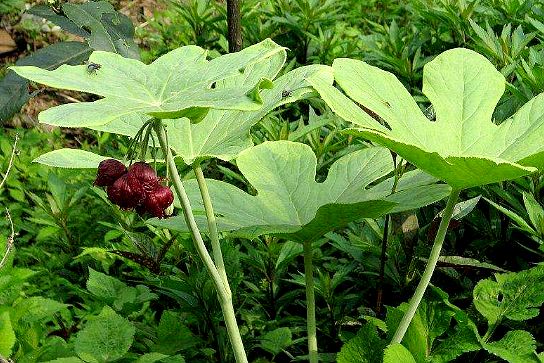 多年生草本。根茎横卧,棕褐色,木质化,具粗壮的须状根。茎直立,高30~50厘米。茎生叶1,有时2,分别着生于茎的近顶处和茎的中部;叶片盾状,圆形,直径达30~40厘米,5~9裂,裂片卵状矩圆形,长5~8厘米,宽5~7厘米,先端锐尖,下面疏生柔毛或无毛,边缘有针刺状细齿;叶柄长10~15厘米。伞形花序,花8~10,生于茎顶一叶的叶柄基部,下垂;萼片6,椭圆形,外面有疏长毛;花瓣6,2轮,长2厘米,深红色;雄蕊6,花丝开张,花药内向:子房上位,1室,柱头大,盾状。浆果椭圆形或卵形。种子多数。花期初夏。