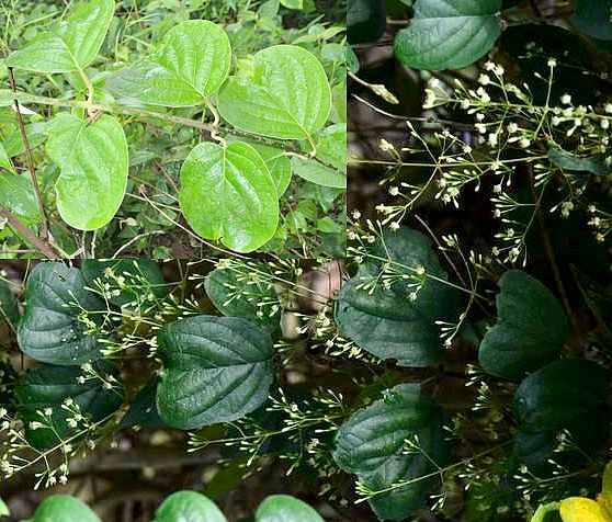 木质藤本,枝被丁字毛。叶对生,纸质或薄革质,倒卵状心形,长宽几相等,约8~10厘米,先端凹,有小尖头,基部圆形或心形,全缘,下面被灰色绒毛。圆锥花序腋生:花小,两性,绿白色;萼短,5深裂,裂片很小,卵状长圆形;花瓣5,倒卵状长圆形:雄蕊10;子房3裂,裂片背部平坦,侧边有翅,花柱3,柱头头状。果实盾翅形,有3枚具薄翅的线形种子合成。