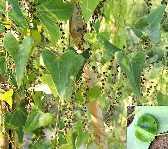 草质藤本。根茎横生。茎纤细,无毛,有纵皱纹或浅槽,有时在分枝或叶柄的基部两侧微凸出,或具短刺。叶互生,盾形;叶片三角状卵形或长卵形,长5~11厘米,宽4~9厘米,边缘浅波状,基部心形或近于截形,通常3裂,中央裂片先端渐尖,两侧裂片圆耳状;叶柄短于叶片。花单性,雌雄异株;雄花序穗状,腋生,有时分枝;花无柄,常2~3朵簇生,仅1~2朵完全发育;苞片膜质,卵形或三角状卵形;花被片6,卵形,紫红色,雄蕊6;雌花序有花6~8朵,花有短柄,花被6裂,雄蕊退化;子房长圆柱形。蒴果干燥后蓝黑色,表面附有白色粉状物,翅近半月形,长约2.5厘米,宽约1.5厘米,顶端微凹,或近于截形,基部狭圆形、种子扁卵圆形,周围呈薄膜状的翅。花期5~8月。果期9~10月。