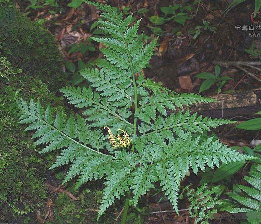 多年生草本,高达26厘米。须根多数,肉质。不育叶柄有灰白色绒毛。叶片长18~25厘米,宽24~27厘米或更宽,下部3~4回羽状,基部1对羽片最大,三角形,长达15厘米,宽6~8厘米,末回小羽片或裂片边缘有粗大重锯齿。孢子叶自不育叶的下部或近基部生出,比不育叶短,2~3回羽状,复圆锥形,长8~11厘米,柄长5~7厘米,小穗张开,疏松,有绒毛。
