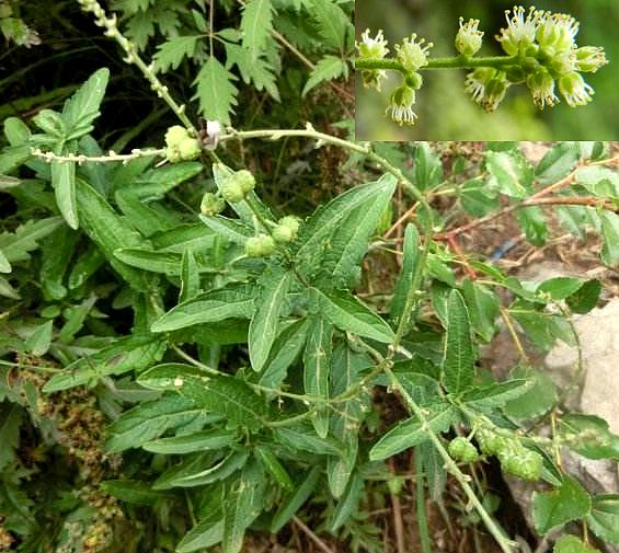 多年生草本,高15~50厘米。根茎横走,淡黄褐色。茎直立,丛生,被灰白色卷曲柔毛。叶互生;无柄或具短柄;叶片披针形至椭圆状披针形,厚纸质,长1.5~7厘米,宽0.5~2厘米,先端钝尖或渐尖,基部阔楔形或近圆形,先端全缘,下面2/3部分具稀大齿牙,两面被白色柔毛,下面并具腺体。总状花序顶生,密被短柔毛;花小,单性,同株;雄花位于花序的上端,具长卵状椭圆形或披针形的叶状苞2枚,苞片内通常具1~3朵花;萼片5,稀4枚;花瓣5,稀4枚,呈鳞片状;黄色腺体盆状,与花瓣互生;雄蕊10~15;花序下部的花略大,中间1朵为雌花,两侧为雄花;苞2枚,雌花具较长的花梗;萼片5~6;花瓣6;子房上位,花柱3枚,均2裂。蒴果三棱状,顶端开裂;每室有种子1枚,三角状倒卵形,绿色。花期4~5月。果期5~6月。