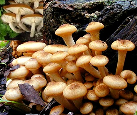 子实体丛生,不发荧光。菌盖初呈扁半球形,后渐平展,宽3~6厘米,蜜黄色,有平伏毛状小鳞片。菌褶延生,浅蜜黄色,不等长,稍稀。菌柄杏仁黄色,基部色较深,上部稍细,纤维质,内部松软,有平伏毛状鳞片,渐变光滑。抱子广椭圆形,光滑,无色,7.2~8.4x5~6.5微米。菌丝体在培养基上初生时白色,在暗处发出浅蓝色荧光。老化后转变为黄棕色至棕褐色,不发光。具发达的根状菌索。