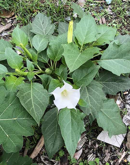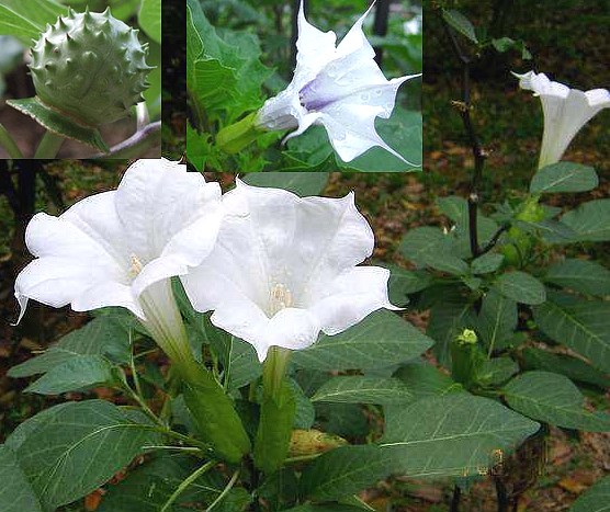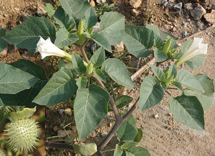 【原植物】①白曼陀罗,又名:风茄儿、山茄子(《纲目》),大颠茄(《生草药性备要》),颠茄、闷陀罗(《广西通志》),野蓖麻、猪颠茄、猪波罗、老鼠愁、白花曼陀罗、金盘托荔枝。