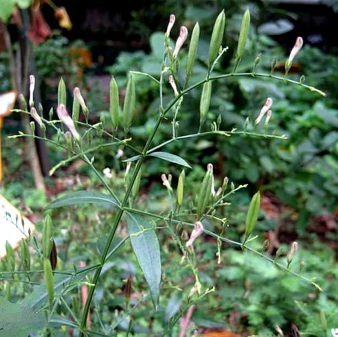 一年生草本,高40~80厘米。茎方形,多分枝,节呈膝状膨大,茎叶具有苦味。叶对生,纸质,叶片长圆状卵形至披针形,长2~8厘米,宽1~3厘米,先端渐尖,基部楔形,全缘或有浅齿,叶柄短或近于无柄。疏散圆锥花序生于枝顶或叶腋;花冠白色,近唇形,常有淡紫色条纹。蒴果长椭圆形,长约1.5厘米,宽约0.5厘米,成熟时2瓣开裂。种子细小,红色。