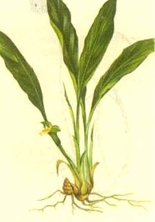 多年生草本,高15~35厘米。根状茎圆形或椭圆形,表面棕褐色,有膜质叶鞘,芳香而有辛辣味。叶通常2~3枚丛生,具长柄,纸质,长椭圆形,先端尖,基部狭楔形,两面无毛,上面叶脉稍突起。花白色,带黄色。
