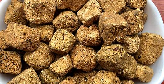 【药材】呈方形或长方形的块状,宽约3厘米,厚约1厘米,外表土黄色,粗糙;质硬脆易断,断面不平,类白色,可见未被粉碎的褐色残渣及发酵后的空洞。有陈腐气,味苦。以陈久、无虫蛀者佳。