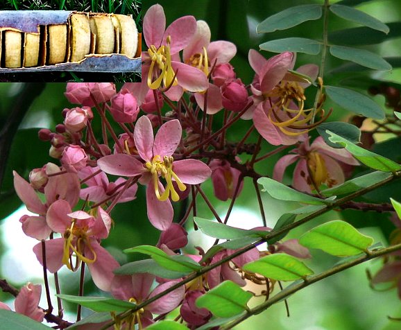 乔木。嫩枝有丝毛。双数羽状复叶,对生;叶柄和叶轴无腺体;小叶6~12对,薄革质,椭圆状矩圆形,长1.5~3.5匣米,宽1~1.5厘米,先端浑圆或凹入,上面秃净,下面被毛。伞形花序顶生,长4厘米;苞片卵状披针形,宿存,长8毫米;萼片5,卵形,长5~8毫米,宽4~6毫米;花瓣5,粉红色,长卵形,具短柄,长2.5~3厘米,宽1~1.5厘米;雄蕊10,3长7短;雌蕊1,花柱内弯,柱头截形。荚果圆筒形,黑褐色,有明显的节,长30~60厘米。花期6月(广州)。