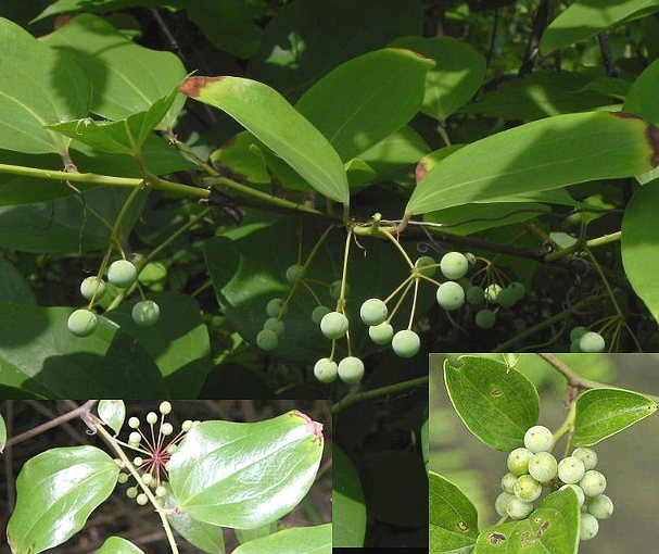 落叶、灌木或攀援藤本,高40~80厘米。茎近圆筒形,多分枝,坚硬:小枝有棱,无刺。单叶互生,卵形,具鞘状叶柄,无卷须。长3~6厘米,宽2~4厘米,先端锐或渐尖,基部圆形、截形或近心形,上面绿色,下面苍白色,光滑,基生脉3~5条,两而均凸出。花序梗细,长1~2厘米,着生2~7花,形成伞形花序;花梗细,长约8毫米;花单性,雌雄同株;雄花花被6,长椭圆形:雄蕊6;雌花较小,花被片6,具退化雄蕊6;子房椭圆形,花柱3裂,反卷。浆果球形,黄黑色带白粉,含种子1~3个。花期5~6月。果期7~8月。