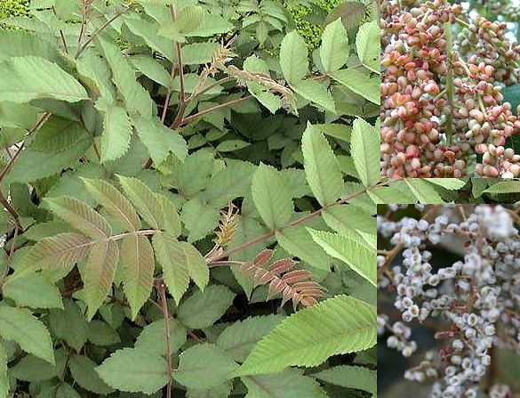 落叶灌木或小乔木,高达8米。树皮灰褐色,有无数皮孔和三角形的叶痕,冬芽有灰黄色的绒毛。单数羽状复叶,互生,具小叶7~13,总叶柄和叶轴有显著的翅,小叶无柄,卵形以至卵状椭圆形,长6~12厘咪,宽4~6厘米,先端急尖,基部圆形以至楔形,边缘有粗而圆的锯齿,下面具棕褐色柔毛。圆锥花序顶生,序梗密生棕褐色柔毛;花小,杂性,两性花的萼片5,广卵形,先端钝;花瓣5,乳白色,倒卵状长椭圆形,边缘内侧基部具柔毛;雄蕊5,花药黄色,丁字着生,花丝黄色;雌蕊较雄蕊短,子房上位,花柱3,柱头头状;雄花略小,中央有退化子房。核果近扁圆形,横径约5毫米,红色,被短细柔毛。花期8~9月。果熟期10月。