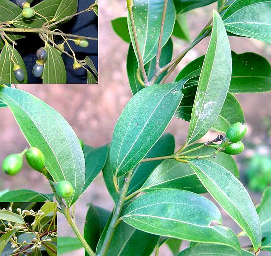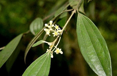 ④川桂,又名:柴桂,臭马桂。常绿高大乔木。枝紫灰褐色,光滑。单叶互生咸近对生;革质;卵形至长卵形,长8~15厘米,宽3~5厘米,先端渐尖而顶点钝,基部楔状或钝形,全缘,上面绿色,无毛,下面微被白粉,幼时有白色绢状毛,后渐脱落;具离基3出脉,在下面不隆起。花小,白色,成圆锥花序或伞形花序;总花梗细长,长1~6厘米,光滑或微被毛,小花梗丝状,先端渐粗,具细毛;花被6裂,内外皆疏生绢状细毛;雄蕊与雌蕊均与前种相似。浆果基部具截形之宿存萼简,全缘。花期5~6月。果期7~10月。