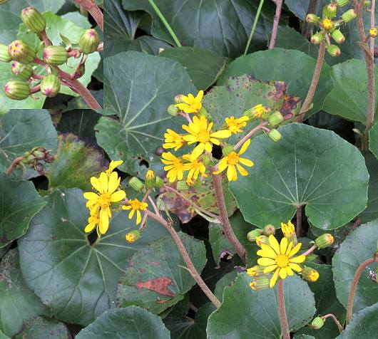 多年生草本,具根茎,基部叶有长柄,肾形,长4~15厘米,宽6~30厘米,边缘具凸头状细齿。花茎直立,高30~70厘米,初具密毛;苞叶长椭圆形或长椭圆状披针形,无柄、头状花序或疏生的伞房状,直径4~6厘米,梗长1.5~7厘米;总苞筒形,长12~15毫米,宽12~20毫米,苞片长椭圆形,先端尖锐,稍有细毛;舌状花一层,雌性,花冠长3~4厘米,宽5~6毫米,黄色;管状花两性,先端5裂,花药基部2裂,裂片线形,先端附片椭圆形。瘦果圆筒形,长5~6.5毫米,具纵纹和短毛;冠毛长8~1l毫米,棕褐色。花期10~12月。