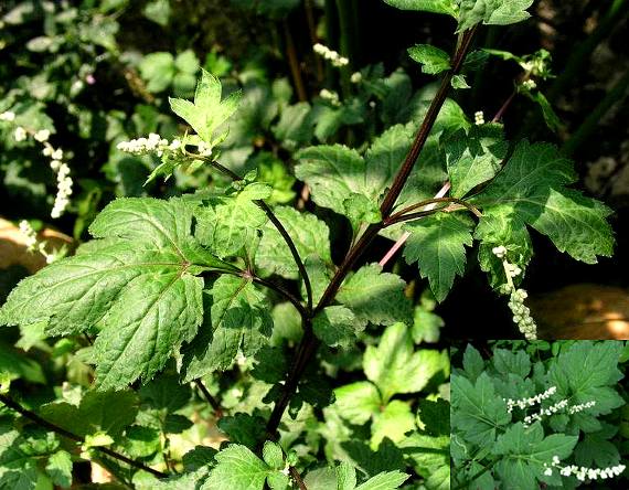 多年生草木,高80~150厘米。茎直立,光滑,具纵槽,上部多分枝。下部叶花时雕落,中部叶有柄和假托叶;叶片广卵形,羽状分裂,裂片3~5,卵状椭圆形或长椭圆状披针形,两面光滑无毛,先端圆钝或短尖,基部楔形,边缘具尖锐复锯齿,顶端裂片通常3浅裂:上部叶无柄,3裂。头状花序卵圆形,无柄,密集成穗状的圆锥花丛;总包钟状卵形,苞片3~4层,最外层者较短,卵形,内层苞片椭圆形,棕色,薄膜质;花杂性,外层雌花,长约2毫米;中央两性花,长2.5毫米,均为管状花;雄蕊5;柱头2裂,裂片先端呈画笔状。瘦果椭圆形,长约1.5毫米。花期9~10月。