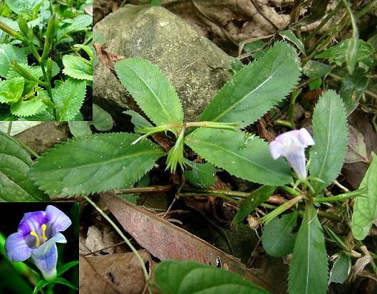 一年生草本。茎柔弱,伏地,分枝,长可达30厘米。单叶对生,倒卵状矩圆形,长1.8~4厘米,先端钝,基部渐狭成叶柄,边缘有锐利的小锯齿。总状花序顶生,小花具柄;萼片5,绿色,裂片线状披针形,长约6毫米;花冠谈紫色,基部筒状,前端2唇形,长约13毫米,上唇阔,凹陷,2裂,下唇扩展,3裂;发育雄蕊2,退化雄蕊2,腺体状;柱头2裂。蒴果圆柱状,长1.5~2厘米。花期6月。