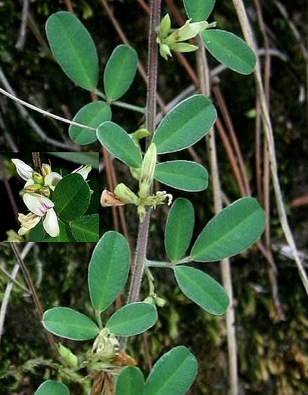 半灌木,高60~80厘米,全株被棕黄色长粗毛。3出复叶;总叶柄长0.5~2厘米;小叶广椭圆形至圆卵形,长8~20毫米,宽5~15毫米,先端圆或截形,微凹,具短尖,全缘。总状花序腋生;总花轴及小花梗极短;小苞片披针形;花萼深5裂,裂片披针形;花冠黄白色,旗瓣有紫斑,倒卵形,翼瓣先端弯,龙骨瓣较小,均具爪;无瓣花腋生成簇。荚果卵圆形,径约3毫米,表面被白色长毛,顶端有喙。花期6~9月。果期10~11月。