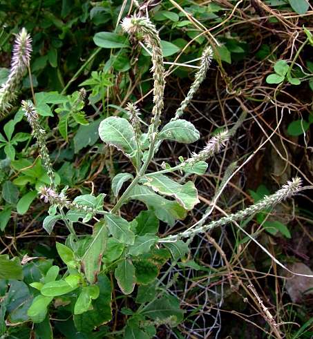 一年或二年生直立草本,高约1米。茎多分枝,披散,圆柱形,紫红色,常有黄褐色纵行纹理,节明显而膨大,幼枝呈四方形,有纵棱,青绿色或紫红色,被白色短毛,老则渐次脱落。叶对生,矩圆状倒卵形至椭圆形或倒卵形,长3~10厘米,宽1~4厘米,先端渐尖,基部狭,全缘,两面密被伏生毛茸。穗状花序顶生,延伸,长4~15厘米,花绿色,长约4毫米,芽时直立,开放后紧贴花轴;小苞片2枚,锥尖,坚挺,通常较萼略短,基部两侧膜质,透明;雄蕊5枚,丁字药,花丝紫红色,退化雄蕊睫毛状,围于子房四周;子房倒圆锥形,花柱单一,柱头不裂。蒴果细小,长圆形,宿萼包着不露出,浅褐色,长约3毫米,倒生于花轴上。花期夏秋至翌年春季。