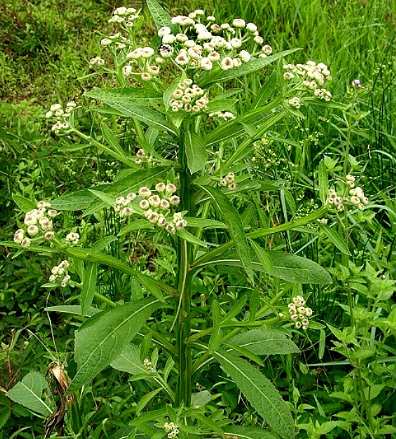 多年生草本,高0.5~2米,全体密被绿色头状腺毛,有强烈臭气。茎圆柱形,具5~8列不规则缺刻的翅。叶互生,椭圆形至长卵形,长10~25厘米,宽5~12厘米,先端尖,边缘有不规则波状锯齿,基部宽楔形或截形,沿叶柄渐狭窄,复沿茎下延成翅;侧脉12~15对。聚伞状圆锥形复花序,每分枝顶端为头状花序;总苞有5~6苞片,苞片线状披针形,色绿而带紫晕;花冠筒状,白色带紫彩,先端5裂;周花数极多,单性,雌蕊1,子房下位,柱头2裂;中央为两性花,15~20,长约8毫米,雄蕊5,花丝贴于花冠上,雌蕊1,柱头玫瑰红色。瘦果长椭圆形,长1.5毫米,顶平截,棕褐色,外具短柔毛;冠毛1列,白色。花期1~5月。6~7月采收,阴干。
