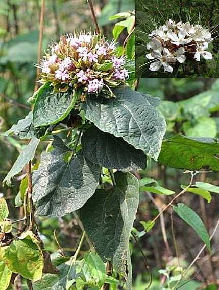 亚灌木,高1~2米,稍被毛。茎直立。叶对生,阔卵形,长11~15厘米或更长,先端渐尖,基部截形或心形,有粗齿,被毛或近秃净,揉之有臭味;具长柄。聚伞花序,具短柄,顶生;花密生如绣球花,直径6~10厘米,芳香。单瓣或重瓣;萼长约1厘米,下部略柔弱,上部扩大,裂片5~6,红紫色,狭而长尖;花冠白色或淡粉红色,在单瓣花中,管长2.5~3厘米,狭而柔弱,裂片亦狭,但在重瓣花中,管长1~1.5厘米;雄蕊4,长,伸出;雌蕊1,花柱突出,柱头2裂,子房上位,4室。肉质核果,有4槽纹,分裂为4小坚果,黑带蓝色。花期晚春至初冬。全年可采。洗净,切片,晒干。