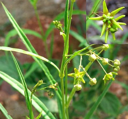 多年生草本,高约65厘米。根茎短,须状根多数。茎细,刚直,节间长。叶对生,披针形至线形,长约5~14厘米,宽约2~8毫米,先端尖,全缘,边缘稍外反,有缘毛,基部渐狭,下面中脉隆起。圆锥花序顶生于叶腋,总花柄多分枝,花梗细柔,花多数;花萼5深裂,卵状披针形,花冠5深裂,广卵形,平展或下反,黄绿色;副花冠5枚,黄色,肉质,肾形,基部与雄蕊合生;雄蕊5,连成筒状,药2室;雌蕊1,子房上位,由2个离生心皮组成,花柱2,柱头合生。??果角状。种子顶端着生多数银白色绒毛。花期6~7月。果期9~10月。