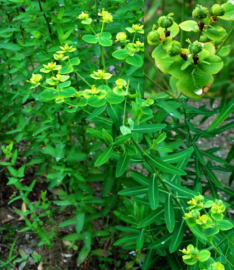 多年生草本,高30~50厘米。叶互生;叶片狭椭圆形或椭圆状披针形,长4~8厘米,宽1.5~2厘米,先端圆,基部楔形。杯状聚伞花序,排成复伞形;伞梗5枝,基部具卵状披针形或三角状长卵形的叶状苞片4~5枚;每枝再分2枝,分枝处有三角卵形或广卵形苞叶2枚,小枝先端具2片较小的苞叶及1个杯状聚伞花序;雌雄花同生于萼状杯形的总苞内,总苞先端4浅裂,腺体4个。蒴果光滑无毛。花期5~6月。