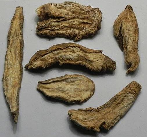 ①狼毒:又名:绵大戟、山萝卜(《滇南本草》),大将军、红狼毒、西北狼毒。为瑞香狼毒的干燥根,呈圆锥形至长圆柱形,稍扭曲,长7~30厘米,直径2~7厘米;根头部留有地上茎残基;外表棕色至棕褐色,有纵皱及横生的细长皮孔,有时残留细根。栓皮剥落后,露出柔软的纤维。体轻,质韧,不易折断,断面中心木质部黄白色,外圈韧皮部白色,呈纤维状。气微,味微甘、微苦而辣。