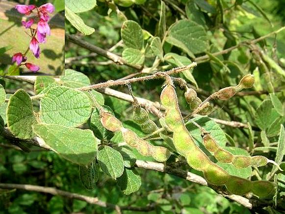 灌木。茎高1~2米,具棱角,疏被柔毛。3出复叶,小叶椭圆状倒卵形,顶端小叶长5.5~9厘米,阔3.5~5.4厘米,两侧较小,先端钝或急尖,具硬尖,基部楔形,钝,上面几无毛,下面脉网上被紧贴的柔毛;叶柄长1.5~4厘米;托叶小,钻形。总状花序腋生或顶生,长达16厘米;苞片披针形,被缘毛,脱落,长1厘米;花梗长约5毫米;花紫色,长10毫米;萼长约4.5毫米,萼齿5,三角形,急尖,与萼筒等长:花冠蝶形,旗瓣圆形至长椭圆形,翼瓣贴生于龙骨瓣上;雄蕊10;子房线形。腹背缝线被绢状毛。荚果长15~24毫米,密被褐色紧贴的绢状毛,腹缝线缢缩,背缝线圆牙齿状;节4~7,长3毫米,阔2.5毫米。花期7~9月。