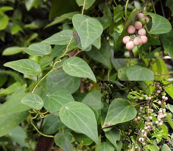 缠绕藤本。枝草质,纤细,有条纹,无毛。叶盾状着生,阔三角状卵形至卵形,长2.5~6.5厘米,宽1.5~4.5厘米,先端渐尖,基部近截平或圆形,全缘,薄纸质,两面无毛,掌状脉5~7条;叶柄长1.5~4厘米。花单性,雌雄异株;花序腋生;雄花序系3花组成的小聚伞花序复作穗状花序式排列,每朵雄花有萼片4或5,分离,倒卵形成倒卵状楔形,无毛,花瓣合生成杯状,聚药雄蕊稍伸出;雌花序系小聚伞花序作总状花序排列,每朵雌花有萼片2,近圆形,花瓣2,大小不等,子房无毛,柱头裂片粗厚,核果近球形,长约3.5毫米,宽约3毫米。花果期夏、秋。秋后采。