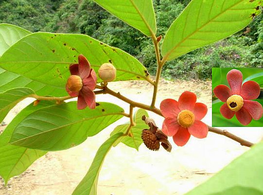 直立或藤状灌木,高约2米,全株密被黄色星状柔毛。单叶互生;长倒卵形或阔长圆形,长10~23厘米,宽5~11厘米,先端急尖或钝,基部圆形或近心形。花1~2朵,与叶对生成腋生,紫红色,直径2.5~3.5厘米;花梗长不及2厘米;萼片3,阔卵形,长约5毫米;花瓣6,2轮,内外轮相似,卵圆形,先端钝,长约13毫米;雄蕊多数,条状矩圆形;雄蕊多数,心皮被星状毛,柱头顶端2裂而内卷。成熟心皮卵圆形或短圆柱形,被星状毛或无毛,暗紫褐色,长8~20毫米,宽7~10毫米,先端有小突尖。种子球形,光滑。花期3~8月。果期7月至翌年3月。