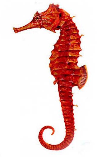 ⑤日本海马:体长76~100毫米。头冠低小,上具5个短小钝棘。吻部较短,约近头长的1/3。体侧扁,腹部突出。尾部四棱形,以后渐细,卷曲。骨质环体部11,尾部37~38;躯干部第1、4、7、11和尾部5、9、10、12体环棱棘特别发达。背鳍16~17,臀鳍4,胸鳍13。体灰褐色,头上、吻部及颊部具不规则斑纹,体侧亦有不规则斑纹,腹缘黑褐色。