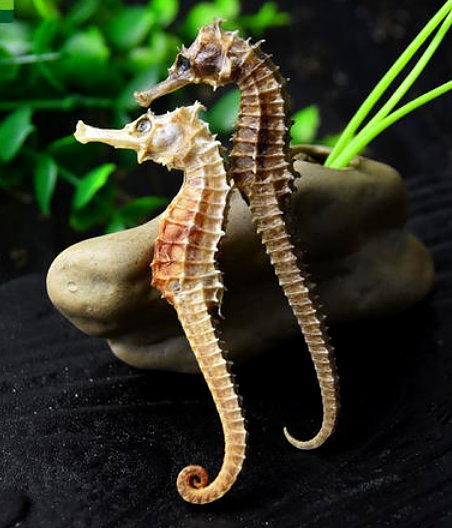 ③大海马:体长20~24厘米。头冠较低,顶端具5个短钝粗棘。吻长恰等于眶后头长。骨质环体部11,尾部35~36;头部及体环与尾环上的小棘均不甚明显。背鳍17,臀鳍4,胸鳍16。体呈黑褐色,头部及体侧有细小暗黑色斑点,且有弥散细小的银白色斑点,背鳍有黑色纵列斑纹,臀、胸鳍淡色。