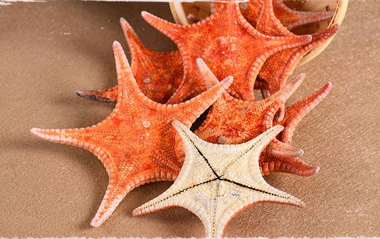 体扁平,呈五角形星状;其中央部称为体盘,体盘背面向上部分,称为反口面,有覆瓦状排列的骨板;反口面外表颜色变化很大,通常呈深蓝色和丹红色交杂排列。腹面向下的部分,称为口面,呈橘黄色,中央有口。体盘四周,有辐状排列的短腕5条,有时亦可见到4~9条者。各腕中央稍隆起如棱,边缘尖锐;腕的腹面有开放的步带沟,沟内列生管足2行,管足上具有吸盘。