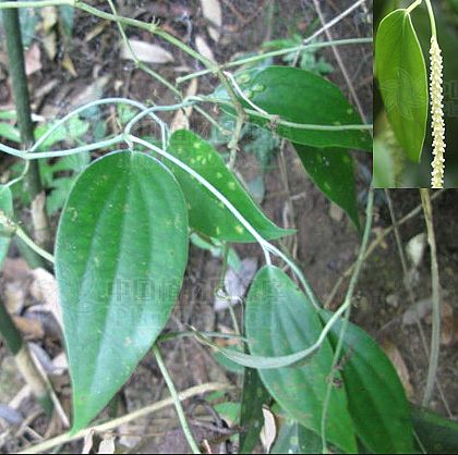 草质或木质藤本。枝干时黄绿色,有细条纹。单叶互生,薄革质,卵形、长圆状椭圆形或椭圆形,稀为卵状披针形,长约6~10厘米,宽2~4厘米,先端渐尖,稍钝,基部圆形,有时阔楔形,全缘,下面常被白色粉霜,有极稀柔毛,主脉5条,少为7条,均基出;叶柄长1~2.5厘米。花单性,雌雄异株,细小,集成穗状花序;雄花序开花时长7~12厘米;苞片倒卵形至倒卵状长圆形,盾状,表面有腺点;雄蕊4;雌花序长8~15厘米,子房倒卵形,柱头4裂。浆果长圆状纺锤形,有细纹,长约5毫米,顶端具很短的宿存花柱。花期3~5月。全年可采。洗净扎把晒干。