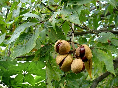 落叶乔木,高达20米,树冠宽广。掌状复叶对生;叶柄长5~16厘米;小叶片5~7枚,长椭圆形或卵状披针形,长8~18厘米,宽2~6.5厘米,先端窄尖,基部楔形,边缘有细锯齿,上面无毛,下面疏生细柔毛或无毛,小叶柄疏生细柔毛。圆锥花序顶生,尖塔形,长18~28厘米;总花梗长6~10厘米,花梗疏生细柔毛;雄花和两性花同株而密生:花小,白色,长1.2厘米;花萼筒形,不整齐的5浅裂,外被短柔毛;花瓣4,椭圆形,上2瓣较下2瓣窄长;雄蕊6~8;两性花的子房上位,有细柔毛,蒴果近于圆球形,顶端扁平或微尖突,密生黄褐色的斑点,3瓣裂,种子1枚,圆球形,直径2.5~4厘米,种脐阔大,占底部的1/2左右,花期5~7月。果期8~9月。