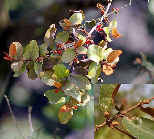 常绿小灌木。老枝无毛,具凸起的灰黄色皮孔,小枝稍被暗灰色短毛。单叶互生或近对生,革质,卵圆形或长卵形。长3~7厘米,宽2~5厘米,先端钝圆,基部圆形或阔楔形,全缘,叶脉稀疏而不明显;叶柄长1~1.5厘米,光滑,或幼时被极短的星状毛。花两性,1~3朵,形成腋生的聚伞花序,总花梗长4~10毫米,被红褐色星状毛;小花梗较短;小苞片1枚,卵形,极小;花萼近球形,与子房合生,外被红褐色的星状毛;花管狭管状,长2~2.5厘米,顶端4裂,裂片紫红色,柔弱,稍弯曲,外被红褐色星状毛;雄蕊4;雌蕊1,花柱细长,柱头扁头状,子房下位,球形。浆果椭圆形,有小疣状突起。花期8~10月。果期9~10月。