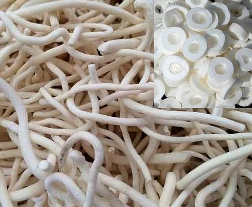 方通草:呈方形的薄片,微透明、平滑、洁白、似纸质而轻软。丝通草:为不整齐之细长条片。