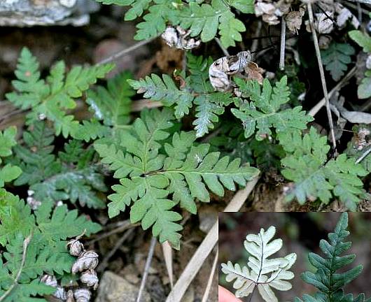 多年生草本,高20~40厘米。根状茎直立,密被红棕色边的亮黑色披针形鳞片,叶丛生;叶柄长7~20厘米,有光泽,褐栗色,除基部被鳞片外无毛;叶片五角掌状,长7~10厘米,宽5~8厘米,2~3次羽状分裂,最下羽片最大,斜三角形,再次羽状深裂,裂片线状长椭圆形;营养叶有微锯齿,叶下面被黄粉,少有无粉的,叶质稍厚,中轴褐栗色。孢子囊群多分布于叶片之边缘,褐色,狭而连续,囊群盖内缘呈疏圆齿状。秋季收取,晒干。