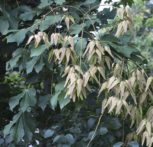落叶乔木,高可达15米。树干直,枝肥粗,树皮青色,平滑,芽近圆形,被褐色短柔毛。单叶互生,3~5掌状深裂,长15~30厘米,宽11~20厘米,基部心形,裂片先端渐尖,幼时上面具毛,后则光滑,下面被星状毛,咏掌状;叶柄约与叶片等长,被褐色毛。圆锥花序顶生:花单性,细小,淡绿色;萼片5,长约8毫米,外密被淡黄色小柔毛;无花瓣;雄花中的雄蕊柱约与萼片等长,花药约15枚,药室不等,聚合成一顶生的头;雌花子房柄发达,心皮5,基部分离,在其周围常有无柄韵花药环绕着,花柱联合。果为??果,成熟前心皮裂成叶状,向外卷曲;种子4~5粒,球形,生于心皮边缘。花期6~7月。果期8~10月。