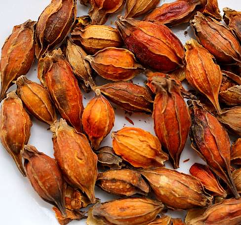 【性状】干燥果实长椭圆形或椭圆形,长1~4.5厘米,粗0.6~2厘米。表面深红色或红黄色,具有5~8条纵棱。顶端残存萼片,另一端稍尖,有果柄痕。果皮薄而脆,内表面红黄色,有光泽,具2~3条隆起的假隔膜,内有多数种子,粘结成团。种子扁圆形,深红色或红黄色,密具细小疣状突起。浸入水中,可使水染成鲜黄色。气微,味淡微酸。以个小、完整、仁饱满、内外色红者为佳。个大、外皮棕黄色、仁较瘪、色红黄者质次。