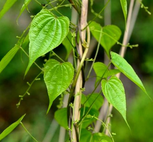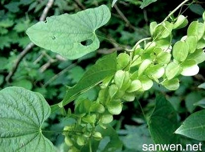 ③山萆解:多年生草质缠绕藤本。根茎横生,类圆柱形,作不规则分歧。茎纤细,高很少超过2米,有纵沟。叶互生,心形至三角状心形,先端渐尖,基部心形,全缘,有时呈浅波状,基出脉7~9条;叶柄长于叶片。花单性,雌雄异株;雄花序为总状或圆锥花序,1至数个腋生;雄花有柄,有苞片及小苞片各1,花被片6,长圆形,其中3片较宽,雄蕊6;雌花序穗状或圆锥状,单生,很少复生。蒴果,翅顶端稍宽,表面栗褐色;种子着生于每室中央的基部。种子扁平,卵形,上端翅宽于种子1倍以上。花期6~8月。果期8~10月。