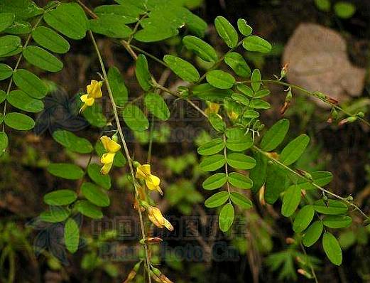 多年生草本,高50~80厘米。主根深长,棒状,稍带木质。茎直立,上部多分枝,光滑或多少被毛。单数羽状复叶互生;小叶6~13对,小叶片椭圆形、长椭圆形或长卵圆形,长5~23毫米,宽3~10毫米,先端钝尖,截形或具短尖头,全缘,上面光滑或疏被毛,下面多少被白色长柔毛;托叶披针形或三角形。总状花序腋生,具花5~22朵,排列疏松;苞片线状披针形;小花梗被黑色硬毛;花萼钟形,萼齿5,甚短,被黑色短毛或仅在萼齿边缘被有黑色柔毛;花冠淡黄色,蝶形,长约16毫米,旗瓣长圆状倒卵形,先端微凹,翼瓣和龙骨瓣均有长爪,基部长柄状;雄蕊10,2体;子房被疏柔毛,子房柄长,花柱无毛。荚果膜质,膨胀,半卵圆形,长2~2.5厘米,直径0.9~1.2厘米,先端尖刺状,被黑色短毛。种子5~6粒,黑色、肾形。花期6~7月。果期8~9月。