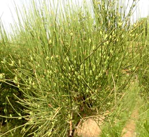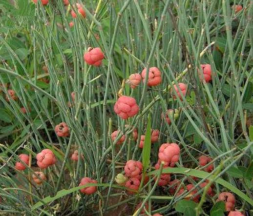 ②木贼麻黄:小灌木,高70~100厘米。木质茎粗大,直立;草质茎节间纤细而短,通常长1.5~2.5厘米,直径1~1.5毫米。鳞叶膜质鞘状,下部3/4合生,上部通常2裂,钝三角形。雄花序多单生,或3~4集生于节上,有苞片3~4对,基部约1/3合生;假花被窄倒卵形,雄蕊6~8;雌花序单生,常在节上成对,花序窄椭圆形,苞片3对,最上1对约2/3合生,胚珠1~2,珠被管长1.5~2.5毫米,常略弯曲。雌花序成熟时成肉红色浆果状,有短柄。种子多为1枚,窄长卵形。花期6~7月。种子成熟期8~9月。