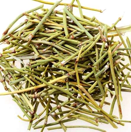 ②木贼麻黄:茎呈细长圆柱形,多分枝,较草麻黄稍细,直径约1~1.5毫米。表面草绿色至黄绿色,有纵走棱线,手触之无粗糙感,节间长1.5~3厘米。节上有2片(稀3片)膜质鳞叶,长约1~2毫米,上部为短三角形,灰白色,尖端多不反曲,基部棕红至黑棕色,连合成筒状。其他与上种相似。