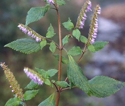 一年生直立草木.根须状。茎高10~30厘米,节甚长,节上具分枝。叶对生,披针形至狭披针形,长2~4.5厘米,宽0.3~0.9厘米,基部楔形,先端渐尖。上半部边缘有疏锯齿,上面绿色,下面灰绿色,并有极微小的腺点,无毛;几无柄。假穗状花序,顶生,长2.5~6厘米;苞片膜质,具紫色多睫毛的纵脉,边缘有锥刺状齿,覆瓦状排列;花小,米黄色,开向花序的一侧面。小坚果极细小,留于宿存的花萼内。花期9~11月。中秋前采收地上部分,晒干,或鲜用。