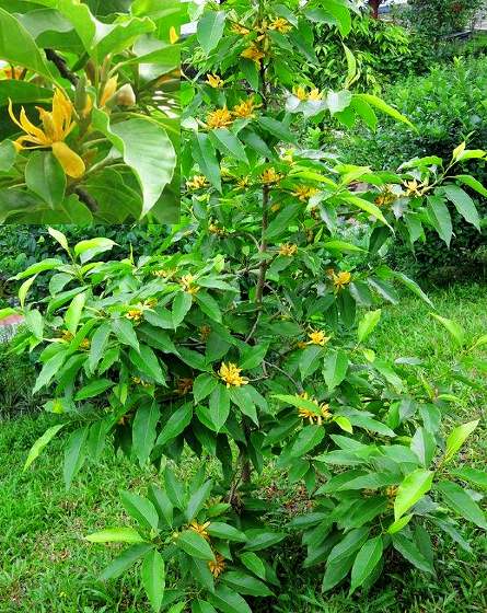 常绿乔木,高达20米,嫩枝和叶柄均被淡黄色的平伏柔毛叶互生,薄革质,披针状卵形或披针状长椭圆形,长10~20厘米,宽5~7厘米,先端长渐尖或近尾状,基部楔形;叶柄长2~4厘米;托叶痕达叶柄中部以上。花单生于叶假,橙黄色,极香;花被片15~20,披针形;雄蕊的药隔顶端伸出成长尖头;雌蕊群柄长约3毫米。聚合果长7~16厘米;??倒卵状长圆形,外有白色斑点。种子有红色假种皮。全年可采。切片晒干。