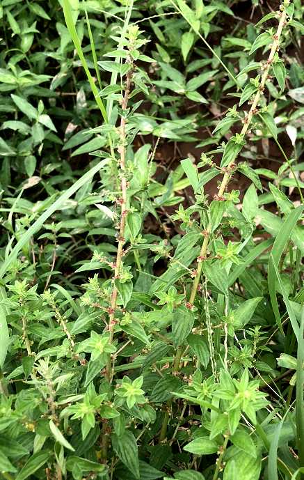 多年生草本。茎披散或多少匍匐状,有时长达90厘米,秃净或多少被疏毛。叶具短柄,胰质,大部互生,或生于下部的有时对生,卵形至卵状披针形,长1.5~3.5厘米,先端短尖,基部浑圆或钝,3主脉,边全缘,两面均粗糙而薄被疏毛。花小,4数,为腋生的花束;雌雄花混生:雄花淡绿色或染紫,花萼4裂,雄蕊白色,突出;雌花的花萼于结果时长不及2毫米,有棱,被毛。瘦果卵形而尖,黑色,有光泽。花期夏月。全年可采,晒干。