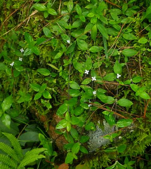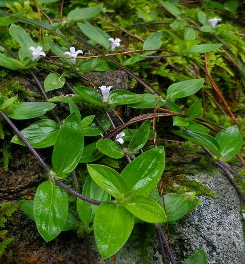 多年生草本,常呈铺散匍匐状,全株均被有黄绿色细长柔毛,以茎、叶柄、托叶、叶背、脉间等处为多。茎具角棱,纤弱,节上有须根。叶对生,具短柄;叶片卵形至长圆状披针形或椭圆形,长1~2.5厘米,宽6~12毫米,先端尖,全缘,基部稍圆;托叶连合成鞘状,膜质,边缘钻状齿裂。花数朵簇生于叶腋;花柄长2~3毫米,萼筒漏斗形,4裂;花冠漏斗形,长5~6毫米,4裂,淡紫白色,稀为白色,4裂;雄蕊4;子房2室,柱头2裂,棒状。蒴果,扁球形,长和宽均约2毫米,室背开裂;萼片宿存。种子黑棕色,细小。花期7月。果期9月。夏、秋采收,晒干或鲜用。