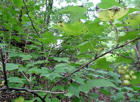 半常绿蔓性灌木,茎有棱,散生钩状刺,幼时有密毡毛或近无毛。叶互生,卵形至长椭圆状卵形,长7~12厘米,先端渐尖,基部心形,边缘有圆齿牙及波状浅裂,有时微3裂,近于平滑无毛;叶柄长2~5厘米。圆锥花序长8~14厘米,花白色,直径约3毫米;萼片被毡毛或近无毛,通常有腺体,宿存;花瓣少有大于萼片者。聚合果由多数小核果集合而成,近圆形,花期8~9月。果期10~11月。