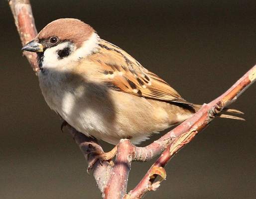 体长约12厘米。嘴粗短,圆锥状,黑色。虹膜暗红褐色。额、后颈纯栗褐色。眼下缘、眼先、颏和喉的中部均黑色;颊、耳羽和颈侧白色,耳羽后部具有黑色斑块,上体砂褐色,翕和两肩密布黑色粗纹,并缀以棕褐色。两翅的小覆羽纯栗色,中和大覆羽黑褐而具白端,大覆羽更具棕褐色外缘;小翼羽、初级覆羽及全部飞羽均为黑褐色,各羽具有狭细的淡棕褐色边缘;外侧初级飞羽的缘纹,除第一枚外,其余羽基和近羽端二处,形稍扩大,成二道横斑状;内侧次级飞羽的缘纹较宽,棕色也较浓。尾暗褐色,羽缘较淡。胸和腹淡灰近白,沾有褐彩,两胁转为淡黄色,尾下覆羽较胁羽更淡。脚和趾均为黄褐色。