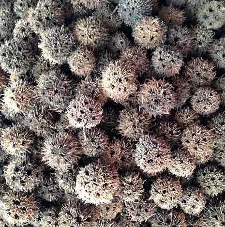 【药材】干燥复果呈圆球形,直径2~3厘米。表面灰棕色或暗棕色,上有多数鸟嘴状针刺,长约5~8毫米,常折断;苞片卷成筒状,有时裂开,内藏多数小蒴果。复果基部残留果柄,有时折断。蒴果细小,直径1~2毫米,顶端有一裂孔,内有种子2枚。种子淡褐色,有光泽。气特异,味淡。以色黄、个大者为佳。
