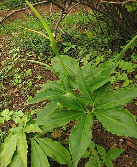 多年生草本。块茎近球形,类似半夏,但较大,径约4厘米。叶柄纤细柔弱,淡绿色,长45~65厘米;叶片掌状分裂,小叶9~11片。肉穗花序顶生,花序柄与叶柄等长或稍长;佛焰苞淡绿色,披针形,下部筒状,长圆形,先端锐尖,长8~14厘米:花单性,无花被,雌雄同株;雄花着生在花序上端,雄蕊密集成圆筒状,长约6毫米,有香蕉香气;雌花着生在花序下部,贴生于苞片上,长约1.5厘米;花序先端附属物线状,长约9厘米,稍弯曲。浆果卵圆形,绿色,长4~5毫米,径2~3毫米,内含种子1粒。花期6~7月。